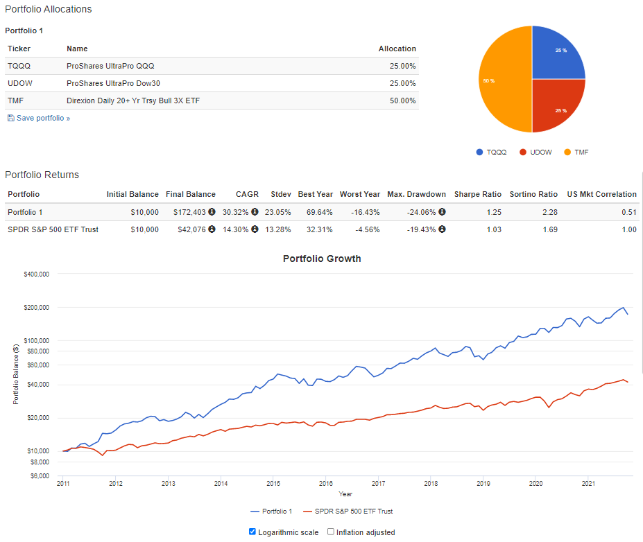 두 번째는 레버리지 ETF 조합 전략입니다. 변동성이 큰 레버리지 상품은 사람들이 들으면 상당히 꺼려합니다. 하지만 변동성은 무기로 두시면 상당히 도움이 됩니다. 상관성이 다소 떨어지는 레버리지 ETF만을 구성하여 이러한 포트폴리오를 구성하실 수 있습니다.