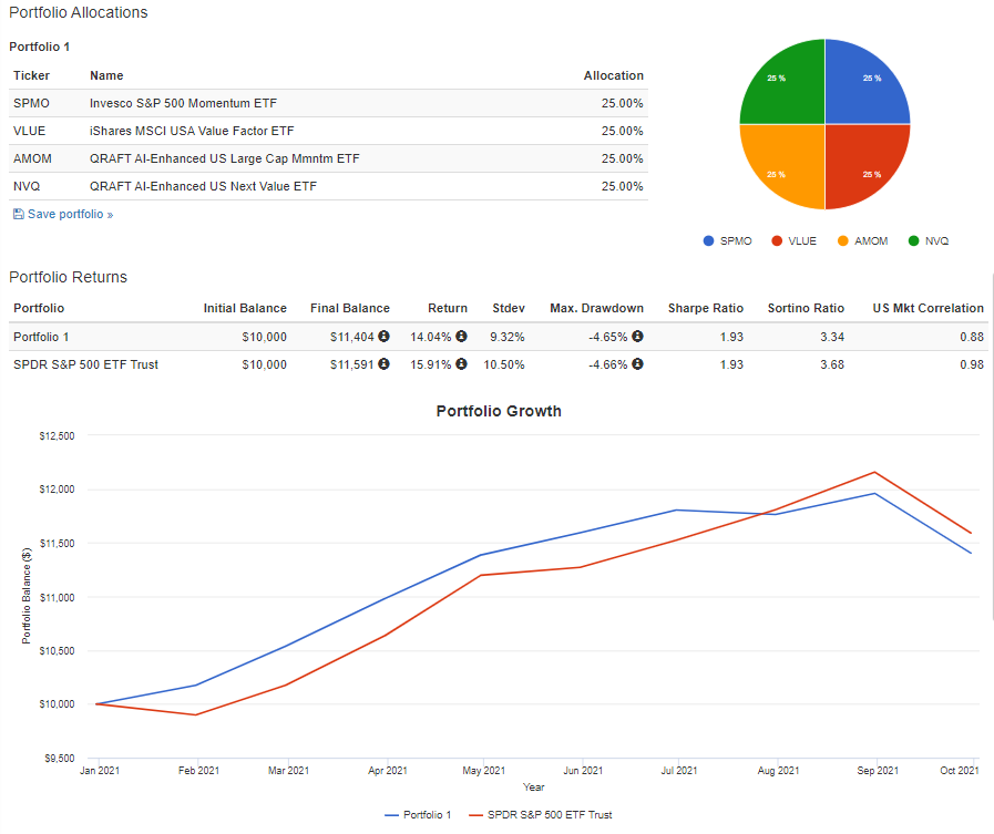 전통 밸류 ETF인 iShares의 VLUE, 모멘텀 ETF는 Invesco의 SPMO를 25%씩 조합하였고, QRAFT AI ETF 대형주 모멘텀 ETF인 AMOM과 밸류 ETF인 NVQ 25%씩 조합한 전략입니다. 참고로 QRAFT 테크놀로지는 우리나라 스타트업으로 미국에 AI ETF를 상장시켰습니다. 한때 테슬라 저점과 고점을 잘 맞춰서 뉴스에서 유행하기도 하였고, 저는 따로 메일을 구독해서 매달 무슨 종목을 편입 편출 했는지 제가 손 매매하는 데 있어서 AI는 어떻게 매매했을까를 참고하기도 합니다.
