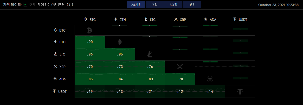 첫째로는 코인의 세계에서는 수많은 코인이 생기고 사라지는 것도 존재하며 종합지수와 같은 느낌이 없습니다. 두 번째로는 비트코인이 코인들의 종합주가지수 같은 이미지가 강한 것도 있고, 비트코인이 하락하면 다른 코인들도 줄줄이 하락하는 경향이 상당히 있습니다. 주식들은 섹터별로 인기 있는 섹터들이 다 다르게 있지만 비트코인은 코인끼리 상관관계가 높기 때문에 코인 내에서 분산투자는 조금 의미가 없다고 생각합니다. 최근에는 비트코인이 잘 가고 알트코인이 힘을 못 내는 경향이 존재하나 Cryptowatch를 보면 최근 1년 동안 비트코인 피어슨 상관 계수가 꽤 높다는 것을 알 수 있습니다. 세 번째로는 코인 트레이딩 성공한 사람들의 이야기를 들어보면 항상 비트코인 움직임을 참고하고 매매를 한다는 이야기를 들었습니다. (마지막으로는 제 개인적으로 비트코인 선물에 좀 집중 매매할 계획에 일부 있어서 비트코인만 기준을 잡았다는 점 이해해주시면 좋겠습니다. )