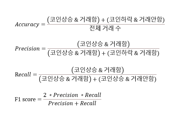자, 그러면 이제 비트코인에 대입해서 지표를 제시하면 아래와 같습니다. 제가 생각하기에는 Precision이 높은 경우가 좋다고 할 수 있겠습니다만 종합적으로 보기 위해서 Precision과 Recall을 종합적으로 고려한 F1 score를 많이 보기도 합니다. F1 score은 Precision과 Recall의 조화평균입니다.